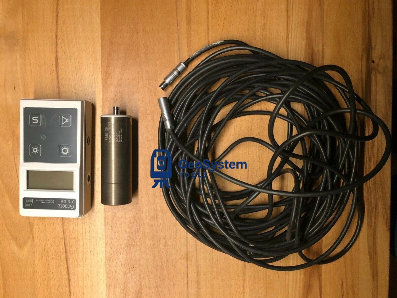 Geiger counter Graetz X 5 DE with additional external probe Graetz 18550 DE incl. connection cable approx. 15 m long.Both internal probe and ext.Probe checked with a test source.Both probes fully functional.The device was permanently installed for room surveillance.Very good condition, hardly any signs of wear.